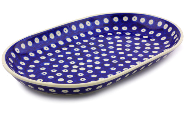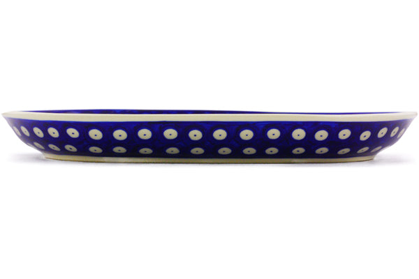 This Blue Eyed Peacock 13" Platter was handmade and hand decorated in Boleslawiec, Poland by skilled artisans according to old traditional methods. This Polish stoneware is microwave, dishwasher, freezer, and oven safe up to 480°F. It does not contain lead or cadmium. It is part of the Blue Eyed Peacock Collection.