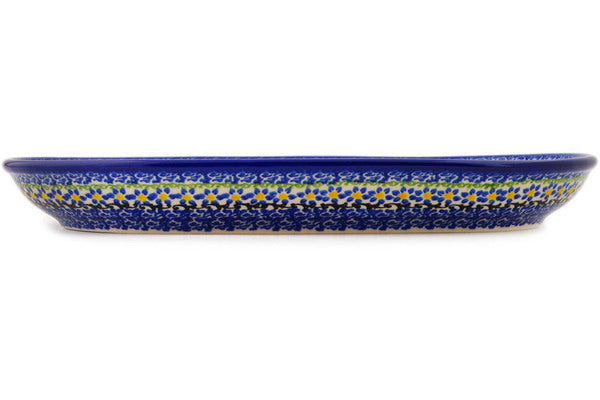 This Cadet Blue Flowers 13" Platter was handmade and hand decorated in Boleslawiec, Poland by skilled artisans according to old traditional methods. This is a Polish pottery Signature Unikat, which means that it has been hand painted with both sponges and brushes and it is signed by the artist who painted it. Unikat pieces are the most intricate works of art. Larger Unikat items take hours of very careful work to finish. This Polish stoneware is microwave, dishwasher, freezer, and oven safe up to 480°F. It does not contain lead or cadmium. It is part of the Cadet Blue Flowers Collection.