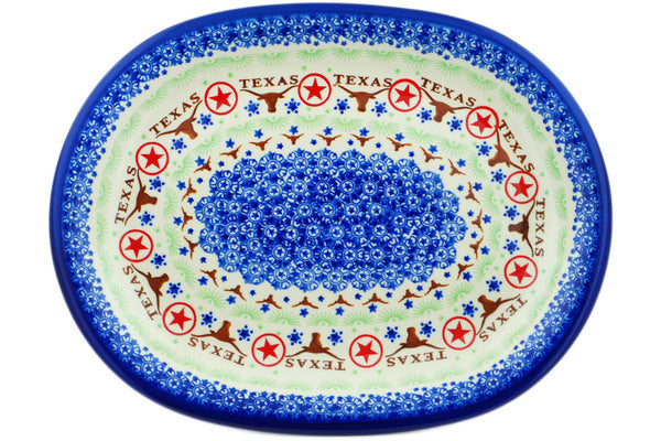This Texas State 14" Oval Platter was handmade and hand decorated in Boleslawiec, Poland by skilled artisans according to old traditional methods. This Polish stoneware is microwave, dishwasher, freezer, and oven safe up to 480°F. It does not contain lead or cadmium. It is part of the Texas State Collection.