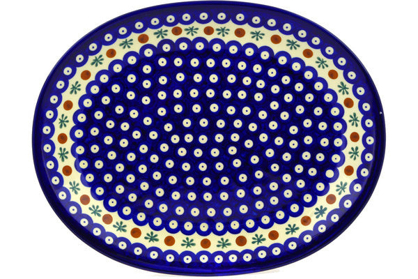 This Fertile Meadow 15" Platter was handmade and hand decorated in Boleslawiec, Poland by skilled artisans according to old traditional methods. This is a Polish pottery Signature Unikat, which means that it has been hand painted with both sponges and brushes and it is signed by the artist who painted it. Unikat pieces are the most intricate works of art. Larger Unikat items take hours of very careful work to finish. This Polish stoneware is microwave, dishwasher, freezer, and oven safe up to 480°F. It does not contain lead or cadmium. It is part of the Fertile Meadow Collection.
