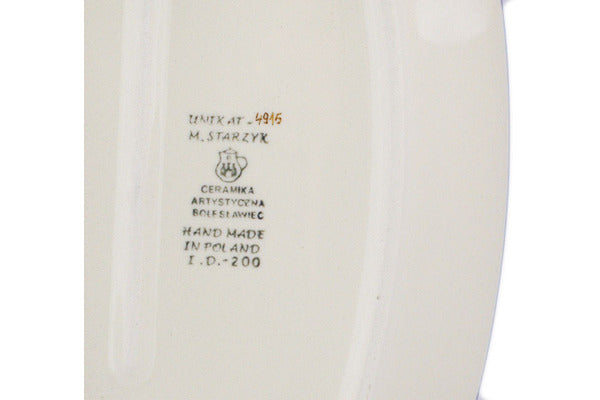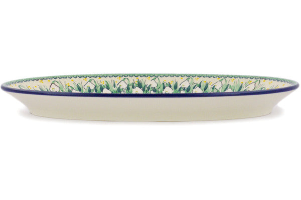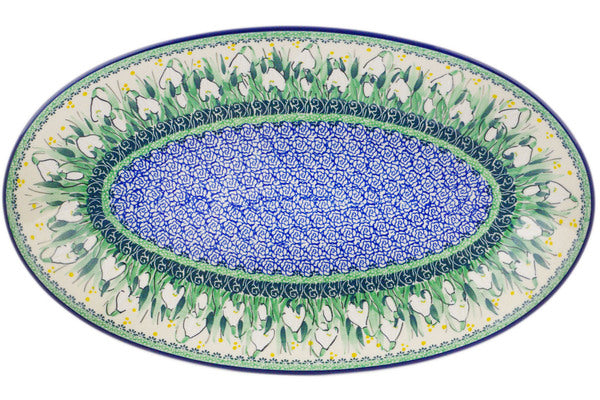 This Snowdrops 15" Platter was handmade and hand decorated in Boleslawiec, Poland by skilled artisans according to old traditional methods. This is a Polish pottery Signature Unikat, which means that it has been hand painted with both sponges and brushes and it is signed by the artist who painted it. Unikat pieces are the most intricate works of art. Larger Unikat items take hours of very careful work to finish. This Polish stoneware is microwave, dishwasher, freezer, and oven safe up to 480°F. It does not contain lead or cadmium. It is part of the Snowdrops Collection.