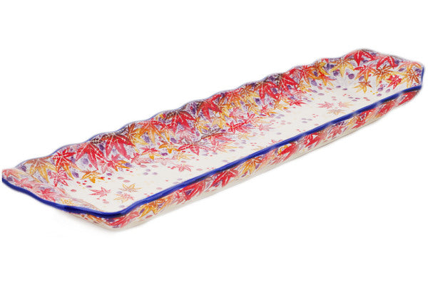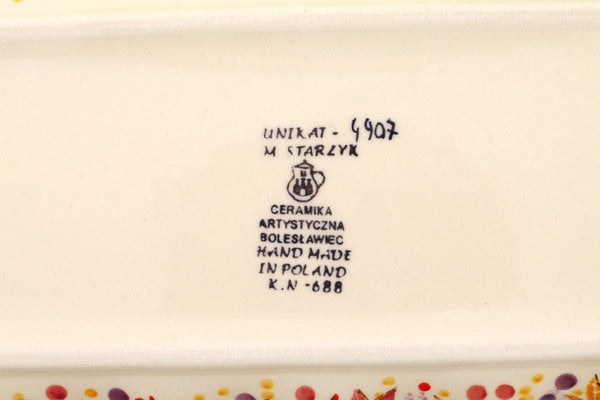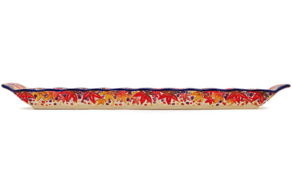 This Perfect Autumn 20" Platter with Handles was handmade and hand decorated in Boleslawiec, Poland by skilled artisans according to old traditional methods. This is a Polish pottery Signature Unikat, which means that it has been hand painted with both sponges and brushes and it is signed by the artist who painted it. Unikat pieces are the most intricate works of art. Larger Unikat items take hours of very careful work to finish. This Polish stoneware is microwave, dishwasher, freezer, and oven safe up to 480°F. It does not contain lead or cadmium. It is part of the Perfect Autumn Collection.