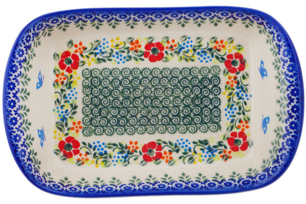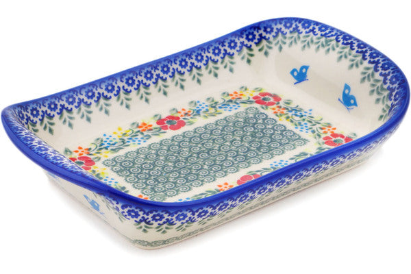This Ring Of Meadow Flowers 10" Platter with Handles was handmade and hand decorated in Boleslawiec, Poland by skilled artisans according to old traditional methods. This Polish stoneware is microwave, dishwasher, freezer, and oven safe up to 480°F. It does not contain lead or cadmium. It is part of the Ring Of Meadow Flowers Collection.