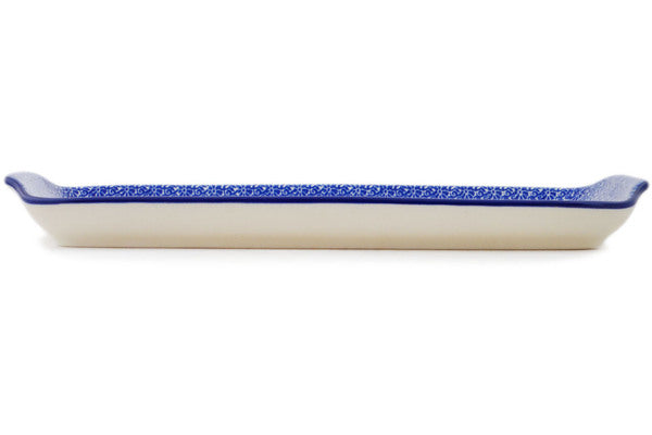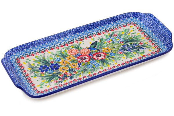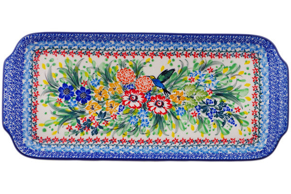 This Hummingbird Meadow 13" Platter with Handles was handmade and hand decorated in Boleslawiec, Poland by skilled artisans according to old traditional methods. This is a Polish pottery Signature Unikat, which means that it has been hand painted with both sponges and brushes and it is signed by the artist who painted it. Unikat pieces are the most intricate works of art. Larger Unikat items take hours of very careful work to finish. This Polish stoneware is microwave, dishwasher, freezer, and oven safe up to 480°F. It does not contain lead or cadmium. It is part of the Hummingbird Meadow Collection.