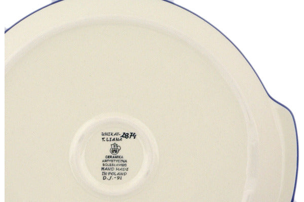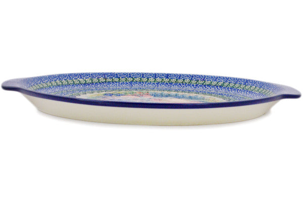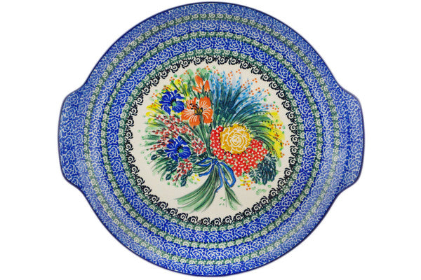 This Iris Bouquet 13" Platter with Handles was handmade and hand decorated in Boleslawiec, Poland by skilled artisans according to old traditional methods. This is a Polish pottery Signature Unikat, which means that it has been hand painted with both sponges and brushes and it is signed by the artist who painted it. Unikat pieces are the most intricate works of art. Larger Unikat items take hours of very careful work to finish. This Polish stoneware is microwave, dishwasher, freezer, and oven safe up to 480°F. It does not contain lead or cadmium. It is part of the Iris Bouquet Collection.