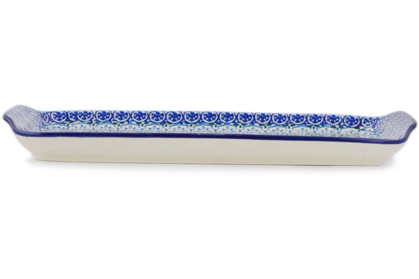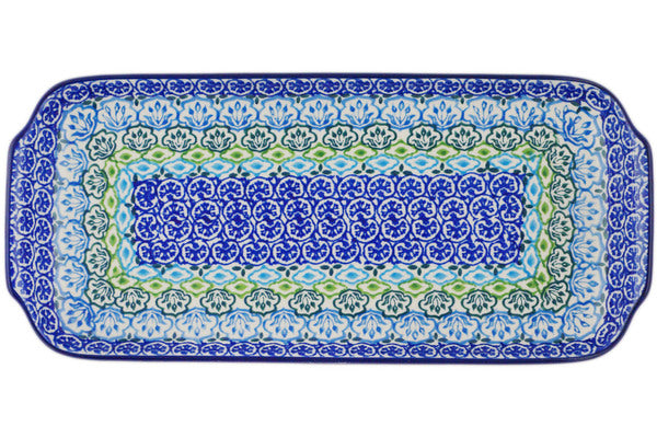 This Ocean Tulips 13" Platter with Handles was handmade and hand decorated in Boleslawiec, Poland by skilled artisans according to old traditional methods. This Polish stoneware is microwave, dishwasher, freezer, and oven safe up to 480°F. It does not contain lead or cadmium. It is part of the Ocean Tulips Collection.