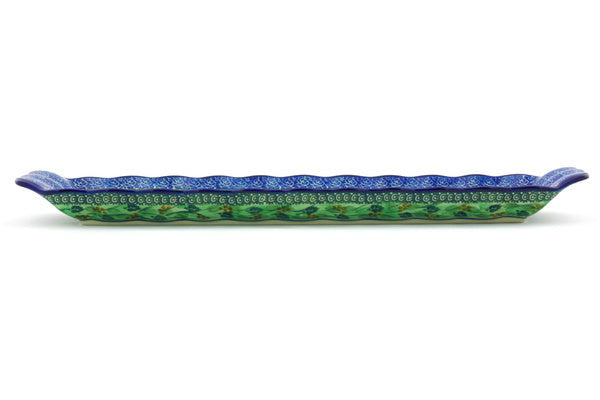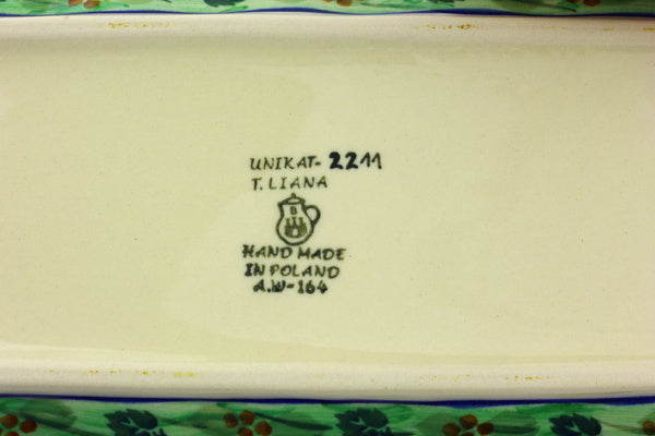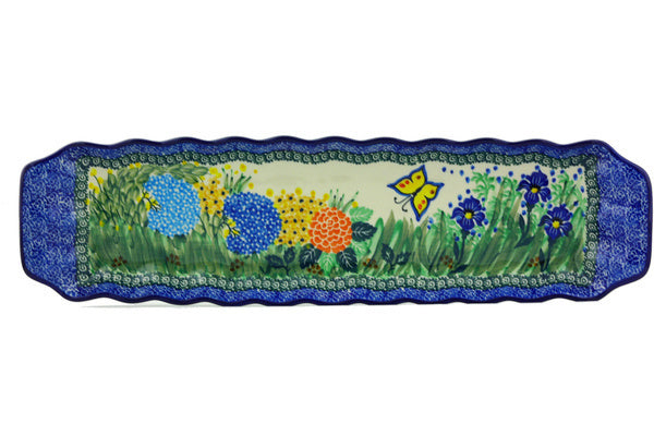 This Spring Garden 20" Platter with Handles was handmade and hand decorated in Boleslawiec, Poland by skilled artisans according to old traditional methods. This is a Polish pottery Signature Unikat, which means that it has been hand painted with both sponges and brushes and it is signed by the artist who painted it. Unikat pieces are the most intricate works of art. Larger Unikat items take hours of very careful work to finish. This Polish stoneware is microwave, dishwasher, freezer, and oven safe up to 480°F. It does not contain lead or cadmium. It is part of the Spring Garden Collection.