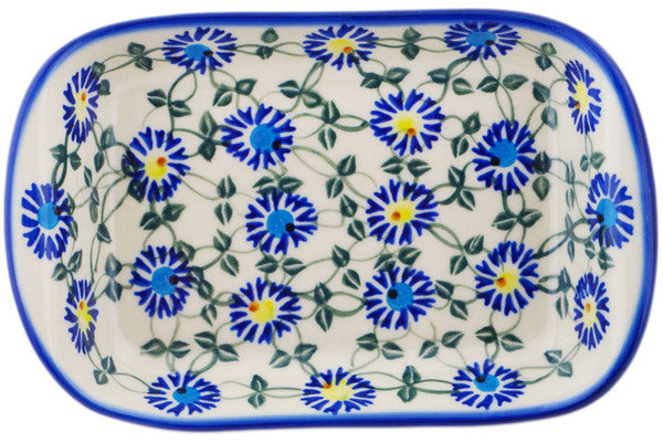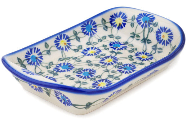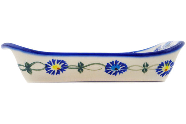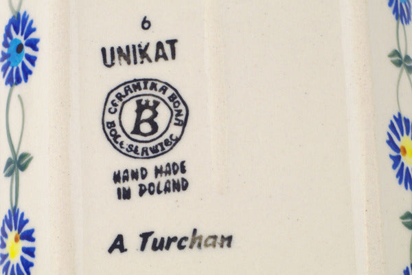 This Blue Thistle Beauty 7" Platter with Handles was handmade and hand decorated in Boleslawiec, Poland by skilled artisans according to old traditional methods. This Polish stoneware is microwave, dishwasher, freezer, and oven safe up to 480°F. It does not contain lead or cadmium. It is part of the Blue Thistle Beauty Collection.