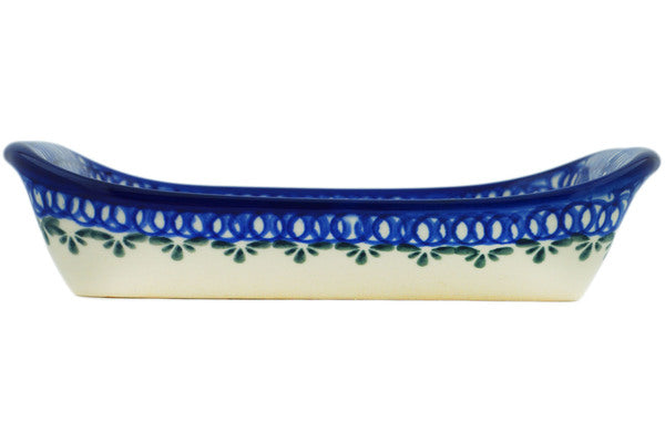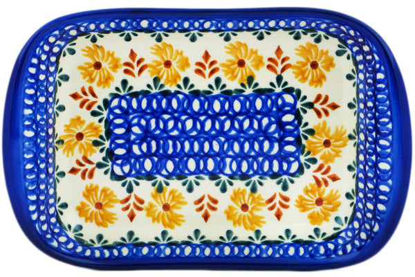 This Golden Flower Garden 7" Platter with Handles was handmade and hand decorated in Boleslawiec, Poland by skilled artisans according to old traditional methods. This Polish stoneware is microwave, dishwasher, freezer, and oven safe up to 480°F. It does not contain lead or cadmium. It is part of the Golden Flower Garden Collection.