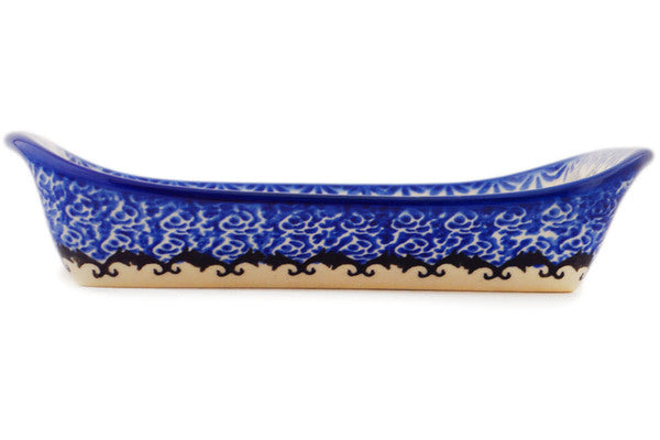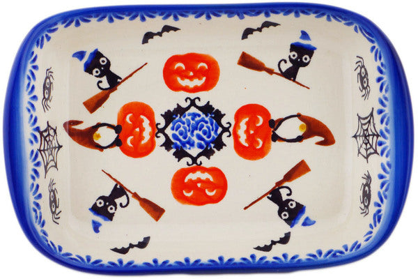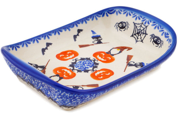 This Spooky Town 7" Platter with Handles was handmade and hand decorated in Boleslawiec, Poland by skilled artisans according to old traditional methods. This Polish stoneware is microwave, dishwasher, freezer, and oven safe up to 480°F. It does not contain lead or cadmium. It is part of the Spooky Town Collection.