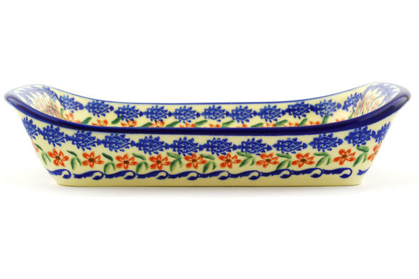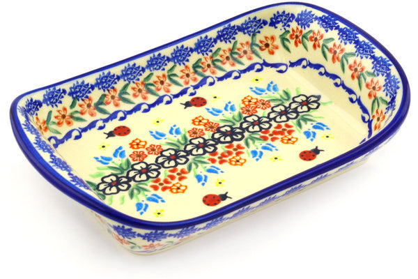 This Fanciful Ladybug 9" Platter with Handles was handmade and hand decorated in Boleslawiec, Poland by skilled artisans according to old traditional methods. This Polish stoneware is microwave, dishwasher, freezer, and oven safe up to 480°F. It does not contain lead or cadmium. It is part of the Fanciful Ladybug Collection.