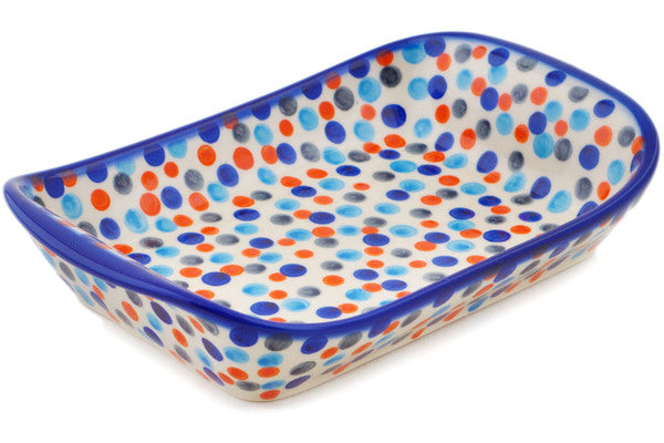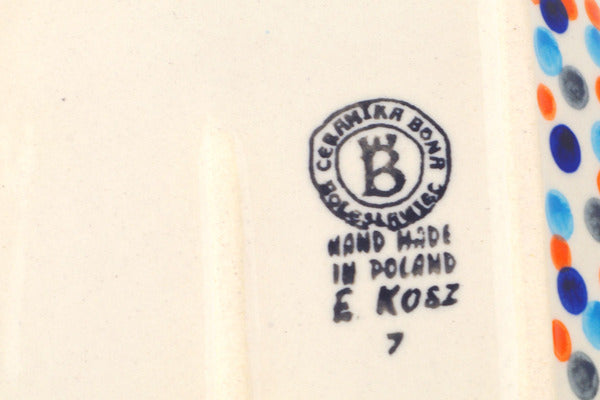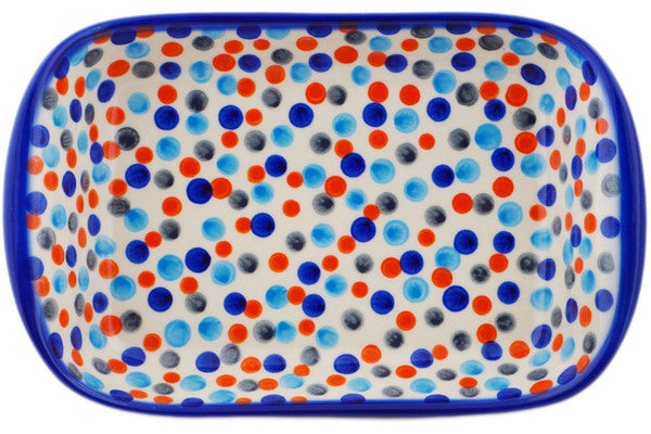 This Polka Dot Frenzy 9" Platter with Handles was handmade and hand decorated in Boleslawiec, Poland by skilled artisans according to old traditional methods. This Polish stoneware is microwave, dishwasher, freezer, and oven safe up to 480°F. It does not contain lead or cadmium. It is part of the Polka Dot Frenzy Collection.