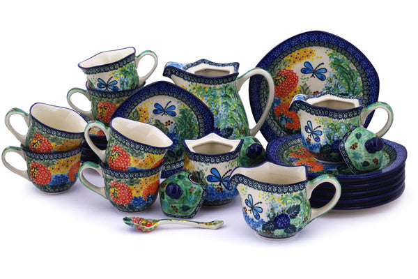 This Garden Delight 29 oz Dessert Set for 6 was handmade and hand decorated in Boleslawiec, Poland by skilled artisans according to old traditional methods. This is a Polish pottery Signature Unikat, which means that it has been hand painted with both sponges and brushes and it is signed by the artist who painted it. Unikat pieces are the most intricate works of art. Larger Unikat items take hours of very careful work to finish. This Polish stoneware is microwave, dishwasher, freezer, and oven safe up to 480°F. It does not contain lead or cadmium. It is part of the Garden Delight Collection.