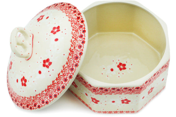 This Poinsettia Lace 6" Pretzel Jar 6" was handmade and hand decorated in Boleslawiec, Poland by skilled artisans according to old traditional methods. This Polish stoneware is microwave, dishwasher, freezer, and oven safe up to 480°F. It does not contain lead or cadmium. It is part of the Poinsettia Lace Collection.