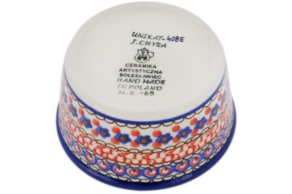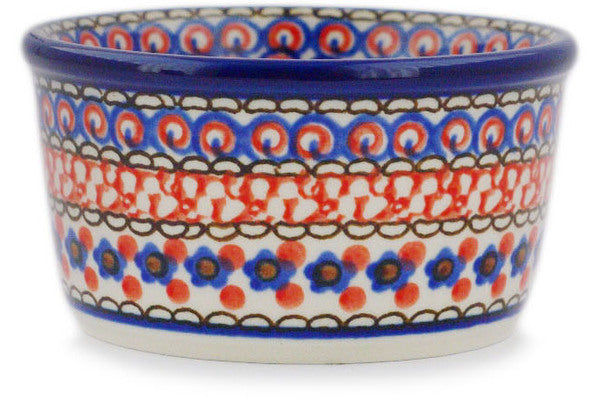 This Crimson Poppies Small Ramekin Bowl was handmade and hand decorated in Boleslawiec, Poland by skilled artisans according to old traditional methods. This is a Polish pottery Signature Unikat, which means that it has been hand painted with both sponges and brushes and it is signed by the artist who painted it. Unikat pieces are the most intricate works of art. Larger Unikat items take hours of very careful work to finish. This Polish stoneware is microwave, dishwasher, freezer, and oven safe up to 480°F. It does not contain lead or cadmium. It is part of the Crimson Poppies Collection.