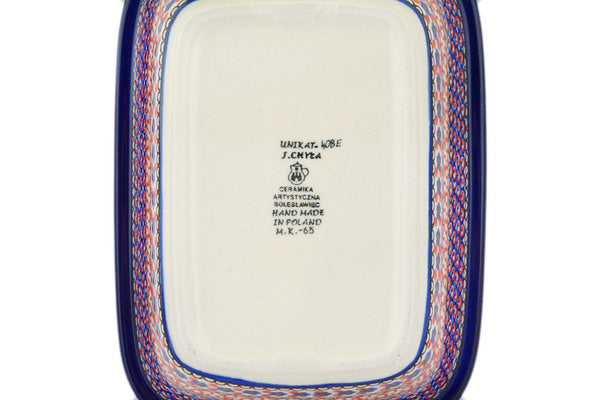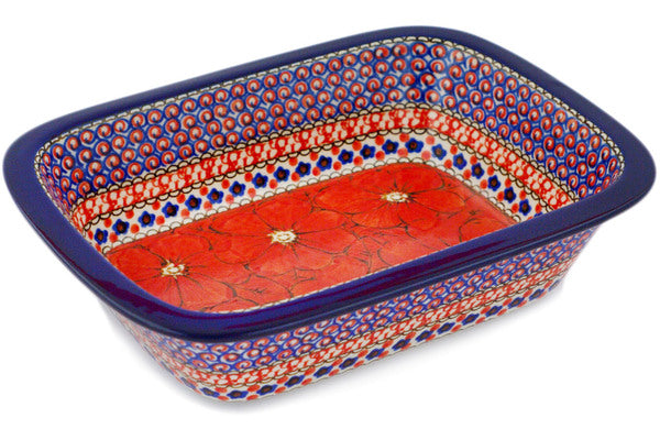 This Crimson Poppies 10" Rectangular Baker was handmade and hand decorated in Boleslawiec, Poland by skilled artisans according to old traditional methods. This is a Polish pottery Signature Unikat, which means that it has been hand painted with both sponges and brushes and it is signed by the artist who painted it. Unikat pieces are the most intricate works of art. Larger Unikat items take hours of very careful work to finish. This Polish stoneware is microwave, dishwasher, freezer, and oven safe up to 480°F. It does not contain lead or cadmium. It is part of the Crimson Poppies Collection.