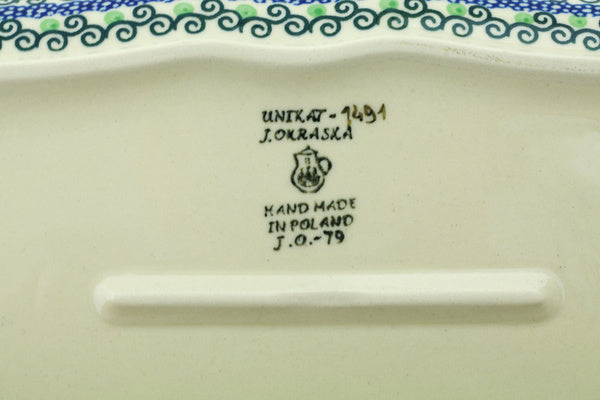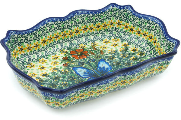 This Butterfly Holly 11" Rectangular Baker was handmade and hand decorated in Boleslawiec, Poland by skilled artisans according to old traditional methods. This is a Polish pottery Signature Unikat, which means that it has been hand painted with both sponges and brushes and it is signed by the artist who painted it. Unikat pieces are the most intricate works of art. Larger Unikat items take hours of very careful work to finish. This Polish stoneware is microwave, dishwasher, freezer, and oven safe up to 480°F. It does not contain lead or cadmium. It is part of the Butterfly Holly Collection.