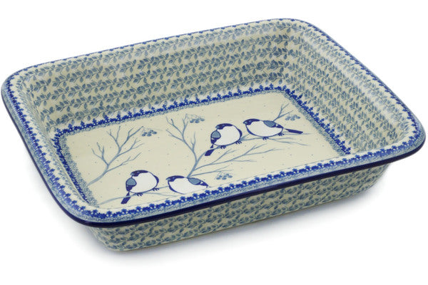 This Waiting Birds 14" Rectangular Baker was handmade and hand decorated in Boleslawiec, Poland by skilled artisans according to old traditional methods. This is a Polish pottery Signature Unikat, which means that it has been hand painted with both sponges and brushes and it is signed by the artist who painted it. Unikat pieces are the most intricate works of art. Larger Unikat items take hours of very careful work to finish. This Polish stoneware is microwave, dishwasher, freezer, and oven safe up to 480°F. It does not contain lead or cadmium. It is part of the Waiting Birds Collection.