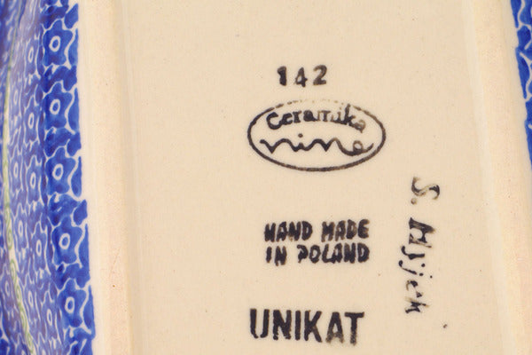This Beekeeper Gnome 8" Rectangular Baker was handmade and hand decorated in Boleslawiec, Poland by skilled artisans according to old traditional methods. This is a Polish pottery Signature Unikat, which means that it has been hand painted with both sponges and brushes and it is signed by the artist who painted it. Unikat pieces are the most intricate works of art. Larger Unikat items take hours of very careful work to finish. This Polish stoneware is microwave, dishwasher, freezer, and oven safe up to 480°F. It does not contain lead or cadmium. It is part of the Beekeeper Gnome Collection.