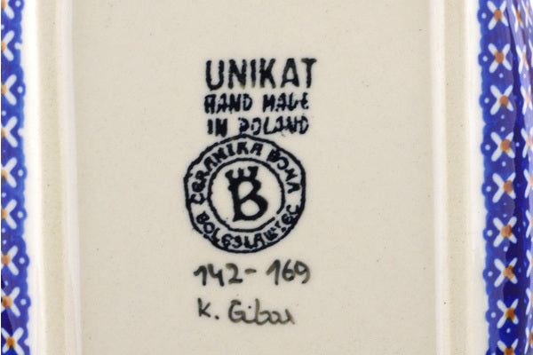 This Blue Cress 8" Rectangular Baker was handmade and hand decorated in Boleslawiec, Poland by skilled artisans according to old traditional methods. This is a Polish pottery Signature Unikat, which means that it has been hand painted with both sponges and brushes and it is signed by the artist who painted it. Unikat pieces are the most intricate works of art. Larger Unikat items take hours of very careful work to finish. This Polish stoneware is microwave, dishwasher, freezer, and oven safe up to 480°F. It does not contain lead or cadmium. It is part of the Blue Cress Collection.