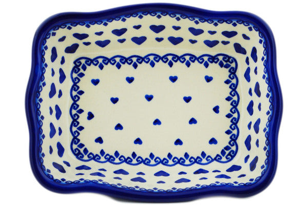 This Blue Valentine Hearts 8" Rectangular Baker was handmade and hand decorated in Boleslawiec, Poland by skilled artisans according to old traditional methods. This Polish stoneware is microwave, dishwasher, freezer, and oven safe up to 480°F. It does not contain lead or cadmium. It is part of the Blue Valentine Hearts Collection.