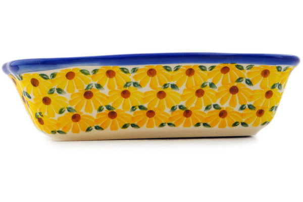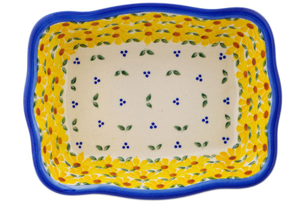 This Sunset Bloom Fiesta 8" Rectangular Baker was handmade and hand decorated in Boleslawiec, Poland by skilled artisans according to old traditional methods. This Polish stoneware is microwave, dishwasher, freezer, and oven safe up to 480°F. It does not contain lead or cadmium. It is part of the Sunset Bloom Fiesta Collection.