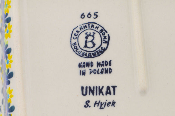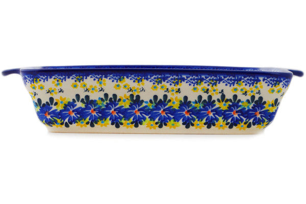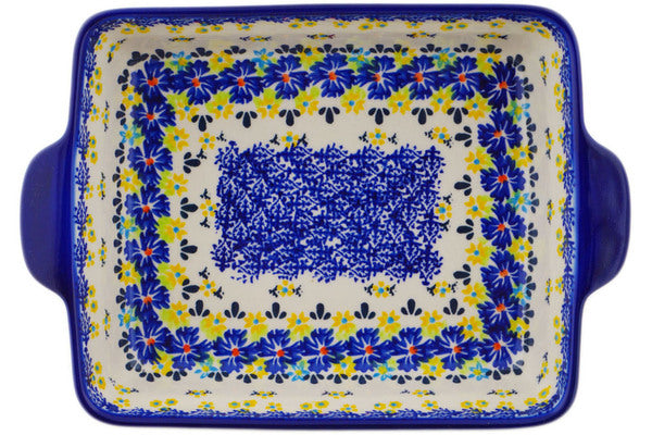 This Cornflower Meadow 11" Rectangular Baker with Handles was handmade and hand decorated in Boleslawiec, Poland by skilled artisans according to old traditional methods. This Polish stoneware is microwave, dishwasher, freezer, and oven safe up to 480°F. It does not contain lead or cadmium. It is part of the Cornflower Meadow Collection.
