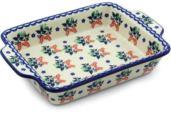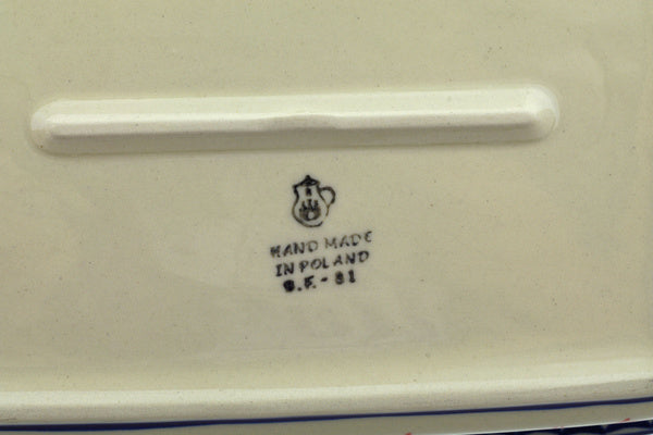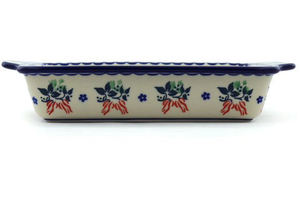 This Fire Cracker 9½-inch Rectangular Baker with Handles was handmade and hand decorated in Boleslawiec, Poland by skilled artisans according to old traditional methods. This Polish stoneware is microwave, dishwasher, freezer, and oven safe up to 480°F. It does not contain lead or cadmium. It is part of the Fire Cracker Collection.
