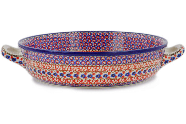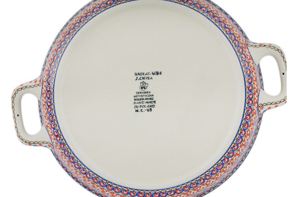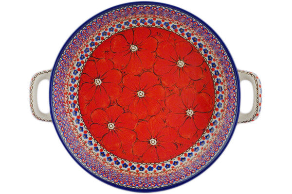 This Crimson Poppies Medium Round Baker with Handles 10-inch was handmade and hand decorated in Boleslawiec, Poland by skilled artisans according to old traditional methods. This is a Polish pottery Signature Unikat, which means that it has been hand painted with both sponges and brushes and it is signed by the artist who painted it. Unikat pieces are the most intricate works of art. Larger Unikat items take hours of very careful work to finish. This Polish stoneware is microwave, dishwasher, freezer, and oven safe up to 480°F. It does not contain lead or cadmium. It is part of the Crimson Poppies Collection.