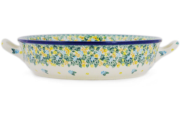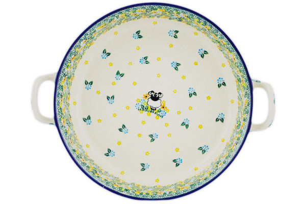 This Sheep In The Meadow 11" Round Baker with Handles was handmade and hand decorated in Boleslawiec, Poland by skilled artisans according to old traditional methods. This Polish stoneware is microwave, dishwasher, freezer, and oven safe up to 480°F. It does not contain lead or cadmium. It is part of the Sheep In The Meadow Collection.