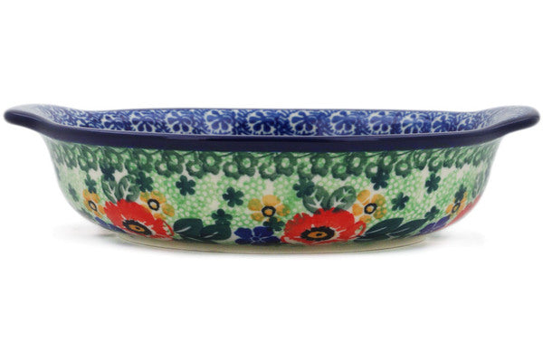 This Window Views 7" Round Baker with Handles was handmade and hand decorated in Boleslawiec, Poland by skilled artisans according to old traditional methods. This is a Polish pottery Signature Unikat, which means that it has been hand painted with both sponges and brushes and it is signed by the artist who painted it. Unikat pieces are the most intricate works of art. Larger Unikat items take hours of very careful work to finish. This Polish stoneware is microwave, dishwasher, freezer, and oven safe up to 480°F. It does not contain lead or cadmium. It is part of the Window Views Collection.