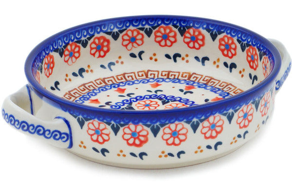 This Amarillo 8" Round Baker with Handles was handmade and hand decorated in Boleslawiec, Poland by skilled artisans according to old traditional methods. This Polish stoneware is microwave, dishwasher, freezer, and oven safe up to 480°F. It does not contain lead or cadmium. It is part of the Amarillo Collection.