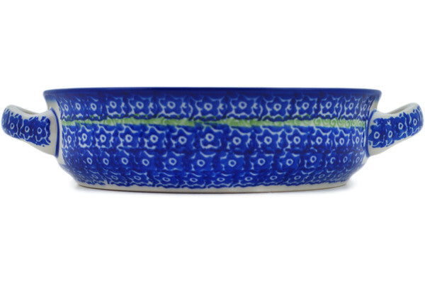 This Beekeeper Gnome 8" Round Baker with Handles was handmade and hand decorated in Boleslawiec, Poland by skilled artisans according to old traditional methods. This is a Polish pottery Signature Unikat, which means that it has been hand painted with both sponges and brushes and it is signed by the artist who painted it. Unikat pieces are the most intricate works of art. Larger Unikat items take hours of very careful work to finish. This Polish stoneware is microwave, dishwasher, freezer, and oven safe up to 480°F. It does not contain lead or cadmium. It is part of the Beekeeper Gnome Collection.