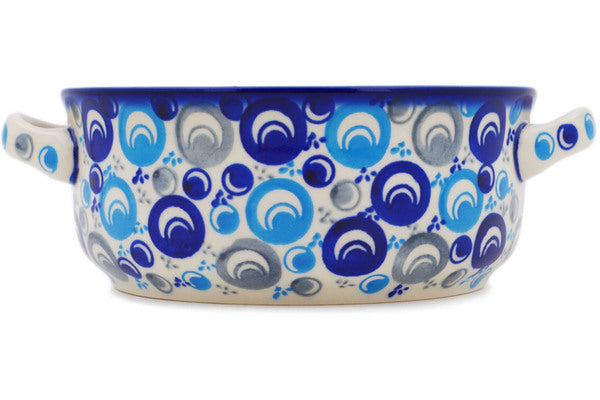 This Blue Peacock Eye 8" Round Baker with Handles was handmade and hand decorated in Boleslawiec, Poland by skilled artisans according to old traditional methods. This Polish stoneware is microwave, dishwasher, freezer, and oven safe up to 480°F. It does not contain lead or cadmium. It is part of the Blue Peacock Eye Collection.