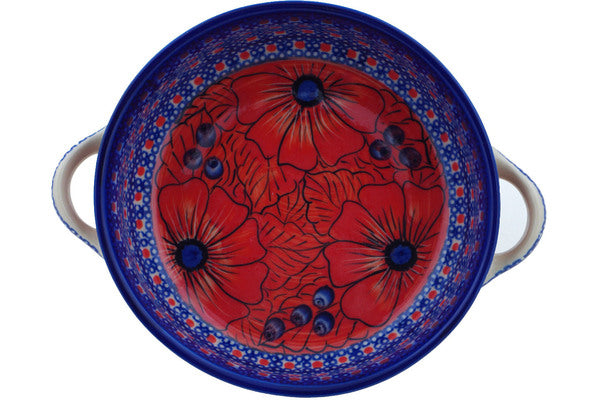 This Red Hot Summer 8" Round Baker with Handles was handmade and hand decorated in Boleslawiec, Poland by skilled artisans according to old traditional methods. This is a Polish pottery Signature Unikat, which means that it has been hand painted with both sponges and brushes and it is signed by the artist who painted it. Unikat pieces are the most intricate works of art. Larger Unikat items take hours of very careful work to finish. This Polish stoneware is microwave, dishwasher, freezer, and oven safe up to 480°F. It does not contain lead or cadmium. It is part of the Red Hot Summer Collection.