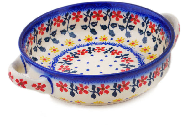This Red Sunflower 8" Round Baker with Handles was handmade and hand decorated in Boleslawiec, Poland by skilled artisans according to old traditional methods. This Polish stoneware is microwave, dishwasher, freezer, and oven safe up to 480°F. It does not contain lead or cadmium. It is part of the Red Sunflower Collection.