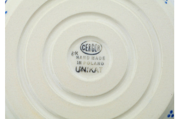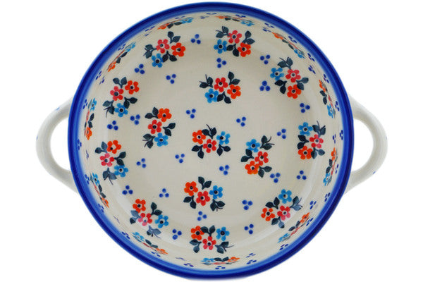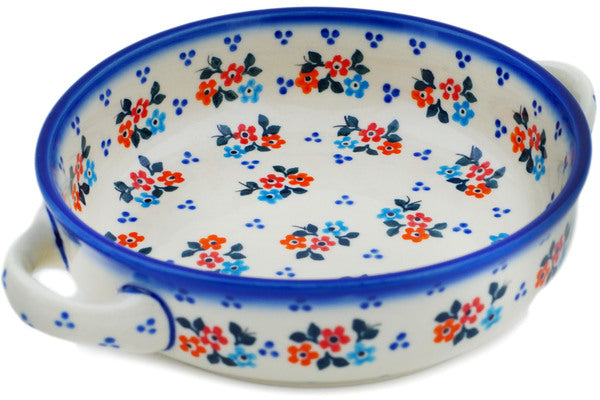 This Sweet Clusters 8" Round Baker with Handles was handmade and hand decorated in Boleslawiec, Poland by skilled artisans according to old traditional methods. This is a Polish pottery Signature Unikat, which means that it has been hand painted with both sponges and brushes and it is signed by the artist who painted it. Unikat pieces are the most intricate works of art. Larger Unikat items take hours of very careful work to finish. This Polish stoneware is microwave, dishwasher, freezer, and oven safe up to 480°F. It does not contain lead or cadmium. It is part of the Sweet Clusters Collection.
