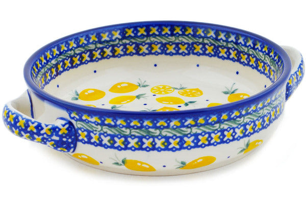 This When Life Gives You Lemons 8" Round Baker with Handles was handmade and hand decorated in Boleslawiec, Poland by skilled artisans according to old traditional methods. This Polish stoneware is microwave, dishwasher, freezer, and oven safe up to 480°F. It does not contain lead or cadmium. It is part of the When Life Gives You Lemons Collection.