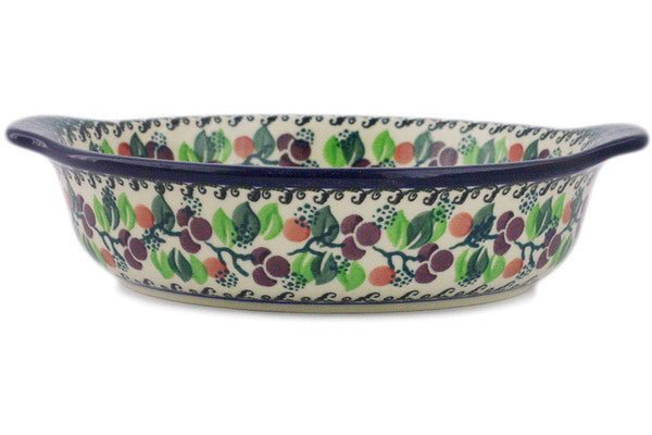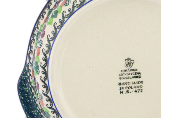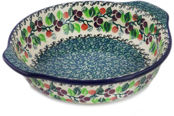 This Berry Garland 9" Round Baker with Handles was handmade and hand decorated in Boleslawiec, Poland by skilled artisans according to old traditional methods. This Polish stoneware is microwave, dishwasher, freezer, and oven safe up to 480°F. It does not contain lead or cadmium. It is part of the Berry Garland Collection.