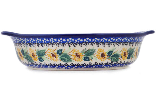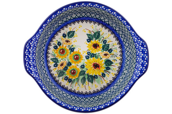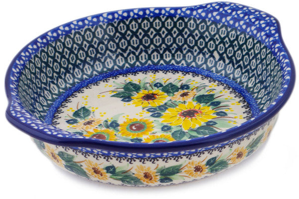 This Sunflowers At Sunset 9" Round Baker with Handles was handmade and hand decorated in Boleslawiec, Poland by skilled artisans according to old traditional methods. This is a Polish pottery Signature Unikat, which means that it has been hand painted with both sponges and brushes and it is signed by the artist who painted it. Unikat pieces are the most intricate works of art. Larger Unikat items take hours of very careful work to finish. This Polish stoneware is microwave, dishwasher, freezer, and oven safe up to 480°F. It does not contain lead or cadmium. It is part of the Sunflowers At Sunset Collection.