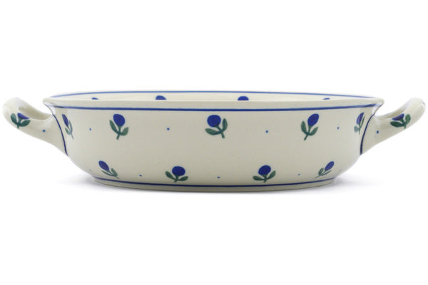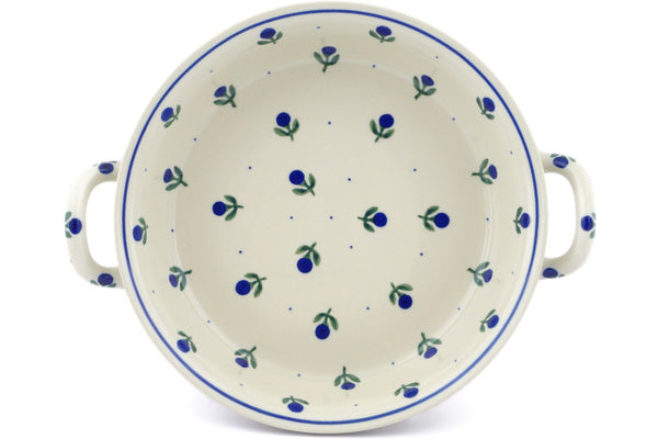 This Blue Buds Medium Round Baker with Handles was handmade and hand decorated in Boleslawiec, Poland by skilled artisans according to old traditional methods. This Polish stoneware is microwave, dishwasher, freezer, and oven safe up to 480°F. It does not contain lead or cadmium. It is part of the Blue Buds Collection.