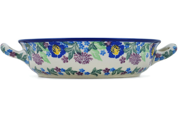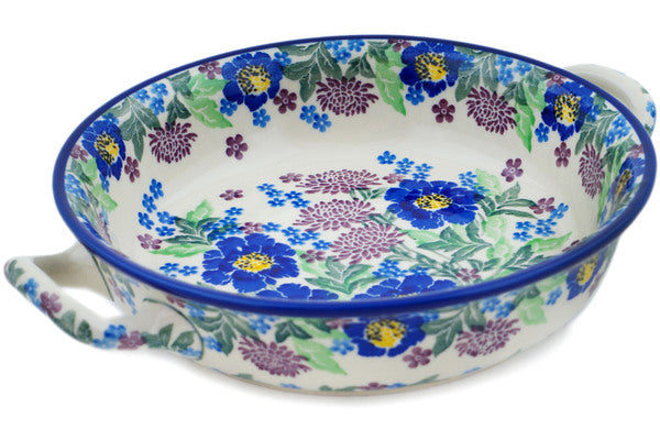 This Byzantium Bliss Medium Round Baker with Handles was handmade and hand decorated in Boleslawiec, Poland by skilled artisans according to old traditional methods. This is a Polish pottery Signature Unikat, which means that it has been hand painted with both sponges and brushes and it is signed by the artist who painted it. Unikat pieces are the most intricate works of art. Larger Unikat items take hours of very careful work to finish. This Polish stoneware is microwave, dishwasher, freezer, and oven safe up to 480°F. It does not contain lead or cadmium. It is part of the Byzantium Bliss Collection.