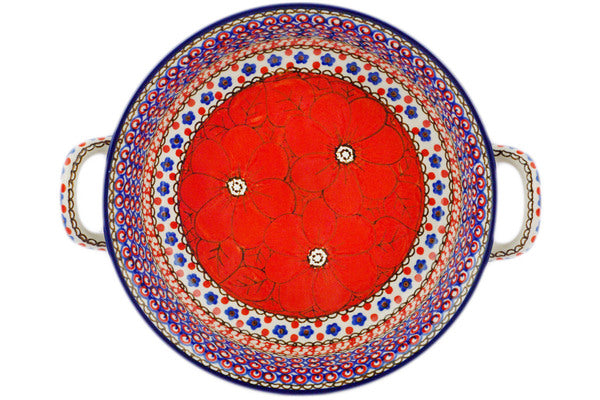 This Crimson Poppies Medium Round Baker with Handles was handmade and hand decorated in Boleslawiec, Poland by skilled artisans according to old traditional methods. This is a Polish pottery Signature Unikat, which means that it has been hand painted with both sponges and brushes and it is signed by the artist who painted it. Unikat pieces are the most intricate works of art. Larger Unikat items take hours of very careful work to finish. This Polish stoneware is microwave, dishwasher, freezer, and oven safe up to 480°F. It does not contain lead or cadmium. It is part of the Crimson Poppies Collection.