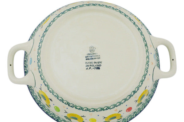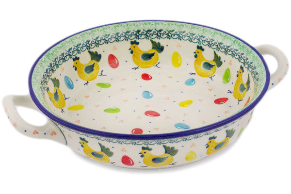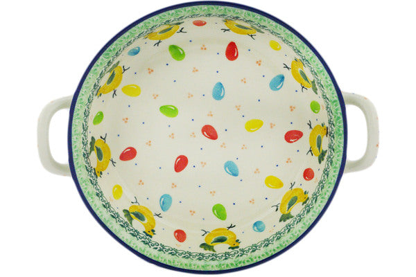 This Egg Hunt Medium Round Baker with Handles was handmade and hand decorated in Boleslawiec, Poland by skilled artisans according to old traditional methods. This Polish stoneware is microwave, dishwasher, freezer, and oven safe up to 480°F. It does not contain lead or cadmium. It is part of the Egg Hunt Collection.
