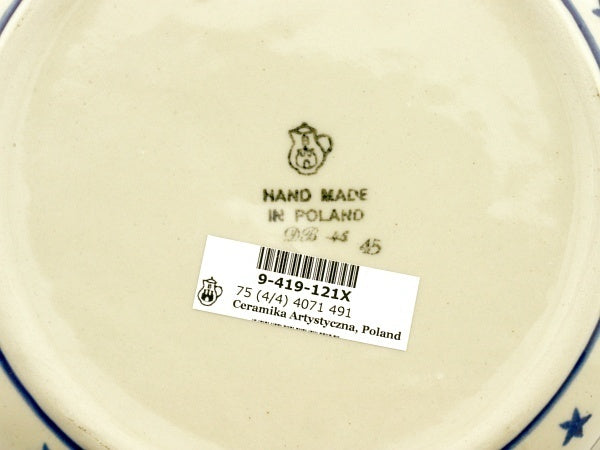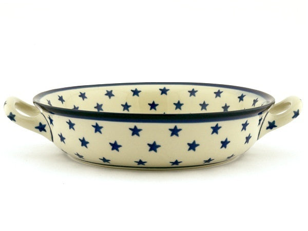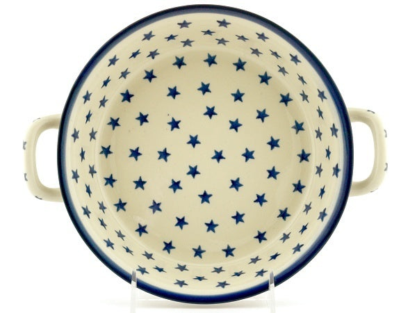 This Starburst Americana Medium Round Baker with Handles was handmade and hand decorated in Boleslawiec, Poland by skilled artisans according to old traditional methods. This Polish stoneware is microwave, dishwasher, freezer, and oven safe up to 480°F. It does not contain lead or cadmium. It is part of the Starburst Americana Collection.