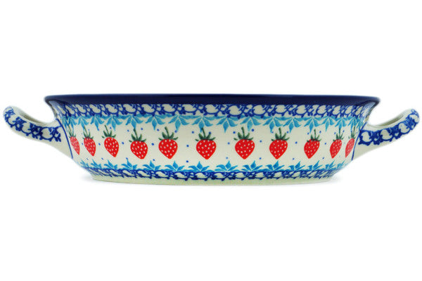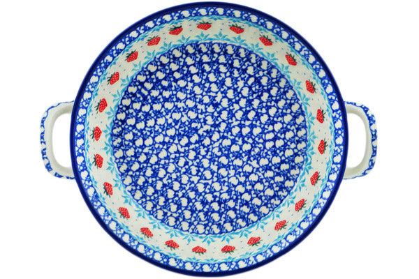 This Strawberry Cake Medium Round Baker with Handles was handmade and hand decorated in Boleslawiec, Poland by skilled artisans according to old traditional methods. This Polish stoneware is microwave, dishwasher, freezer, and oven safe up to 480°F. It does not contain lead or cadmium. It is part of the Strawberry Cake Collection.