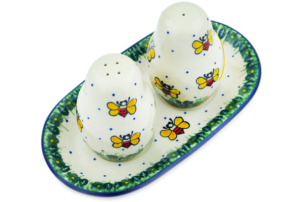 This Bee Happy 7" Salt and Pepper 3-Piece Set was handmade and hand decorated in Boleslawiec, Poland by skilled artisans according to old traditional methods. This is a Polish pottery Signature Unikat, which means that it has been hand painted with both sponges and brushes and it is signed by the artist who painted it. Unikat pieces are the most intricate works of art. Larger Unikat items take hours of very careful work to finish. This Polish stoneware is microwave, dishwasher, freezer, and oven safe up to 480°F. It does not contain lead or cadmium. It is part of the Bee Happy Collection.