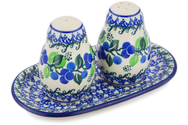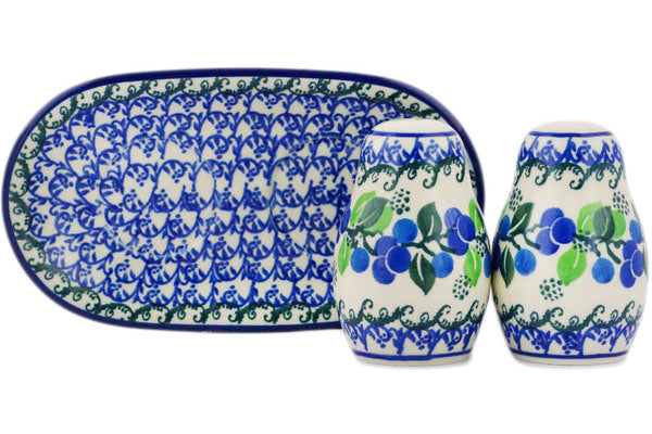 This Limeberry 7" Salt and Pepper 3-Piece Set was handmade and hand decorated in Boleslawiec, Poland by skilled artisans according to old traditional methods. This Polish stoneware is microwave, dishwasher, freezer, and oven safe up to 480°F. It does not contain lead or cadmium. It is part of the Limeberry Collection.