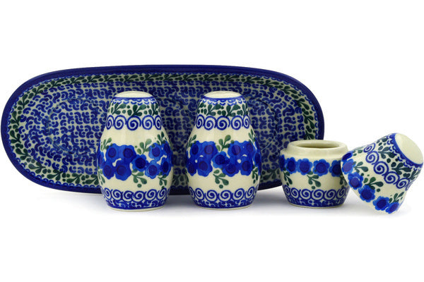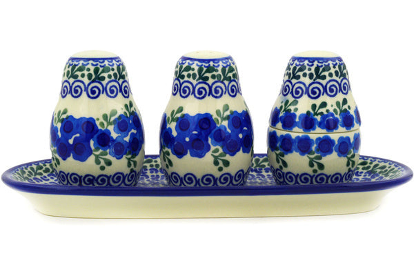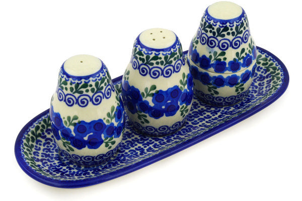 Salt and Pepper with Toothpick Holder 10" Blue Poppy Wreath Theme