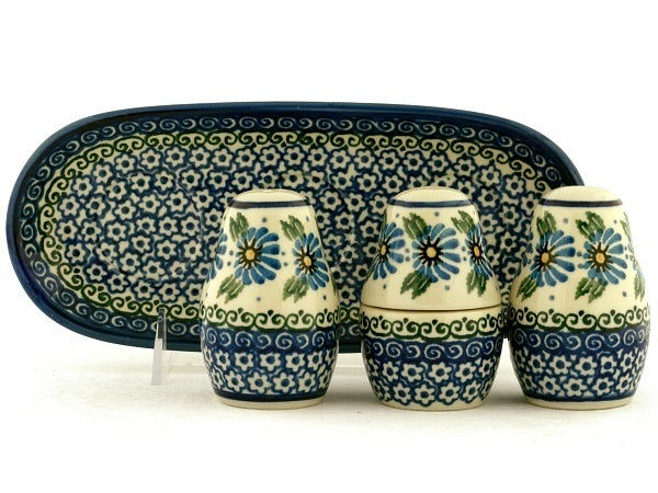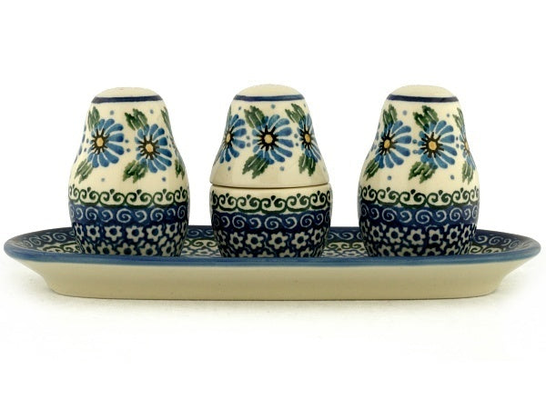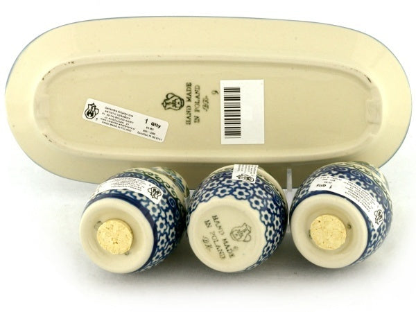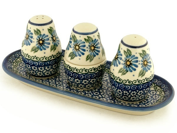 This Marigold Morning 10" Salt and Pepper with Toothpick Holder was handmade and hand decorated in Boleslawiec, Poland by skilled artisans according to old traditional methods. This Polish stoneware is microwave, dishwasher, freezer, and oven safe up to 480°F. It does not contain lead or cadmium. It is part of the Marigold Morning Collection.